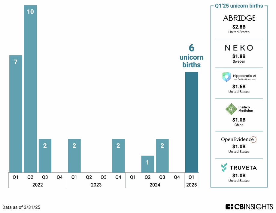 Fig 2. Quarterly unicorn births in digital health from Q1 2022 to Q1 2025.